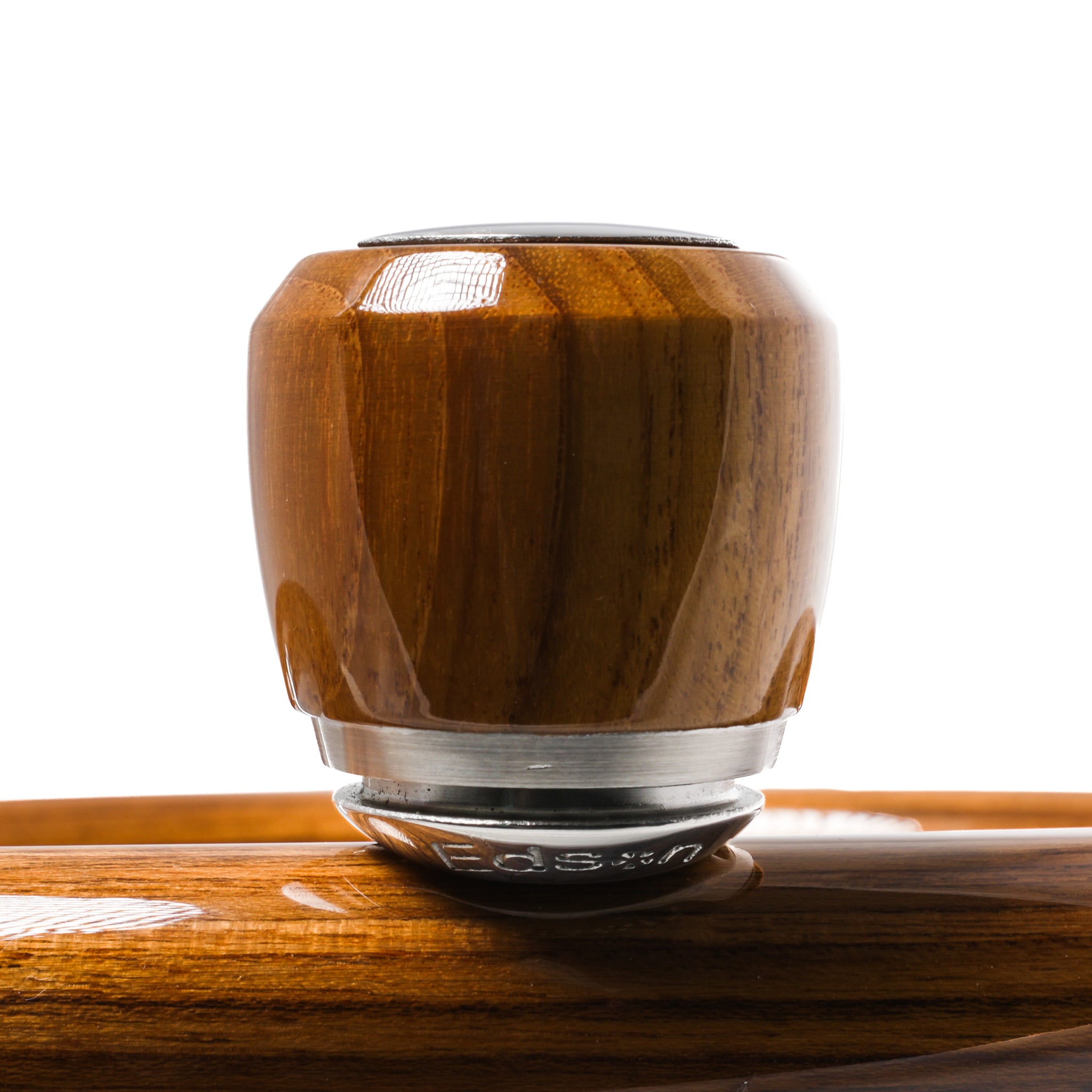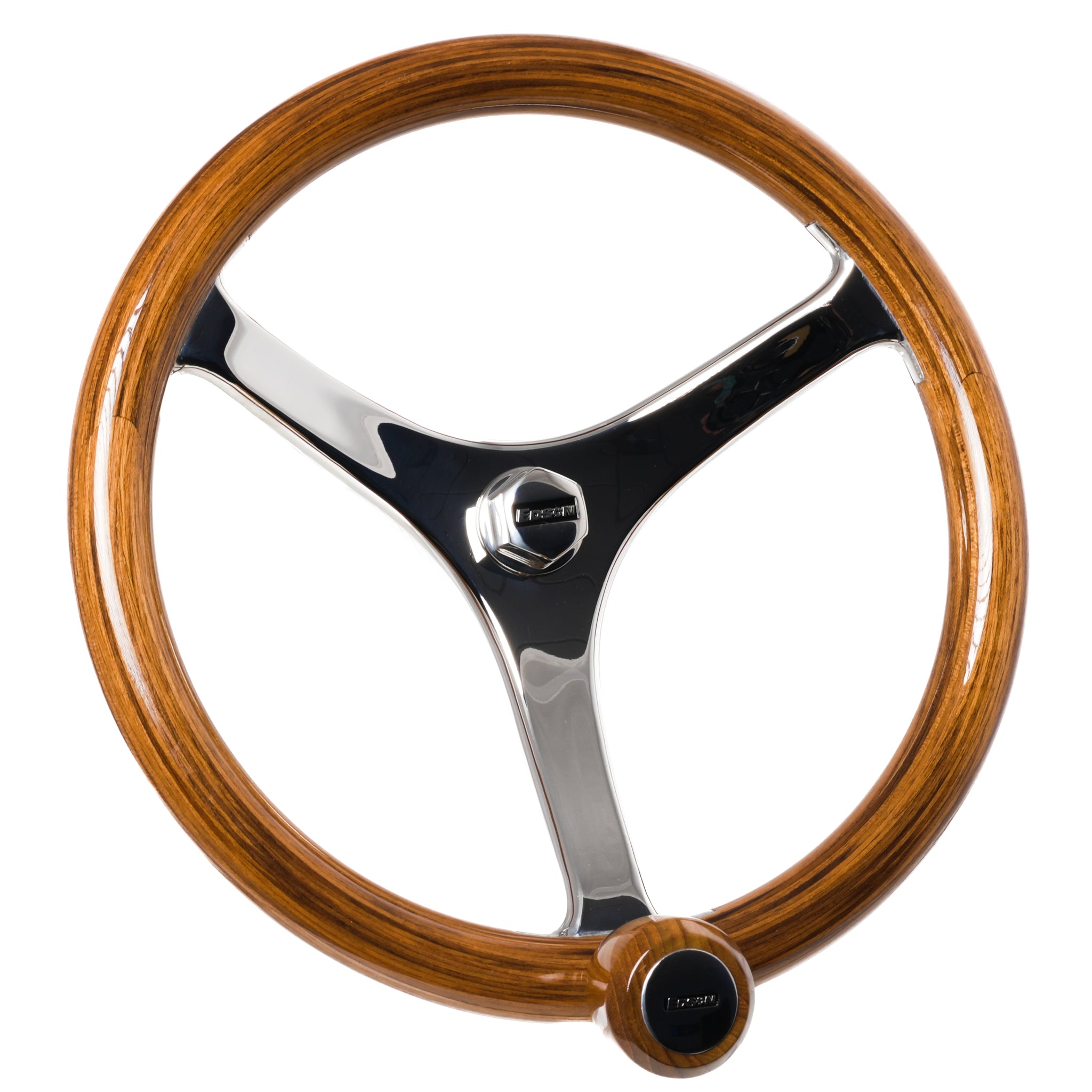 By popular demand, we met the challenge of joining our iconic stainless PowerWheel's center with a 100% teak rim. Layers of natural teak masterfully laminated around a polished stainless steel spider with breathtaking joining and finishing work. It's also built for professional use. Edson's legendary PowerKnob (in your choice of teak or stainless) is mounted directly to a teak rim, giving you the ultimate in helm control. Protected by a crystal-clear catalyzed gloss urethane finish, the wheel's beauty will endure for many seasons to come.