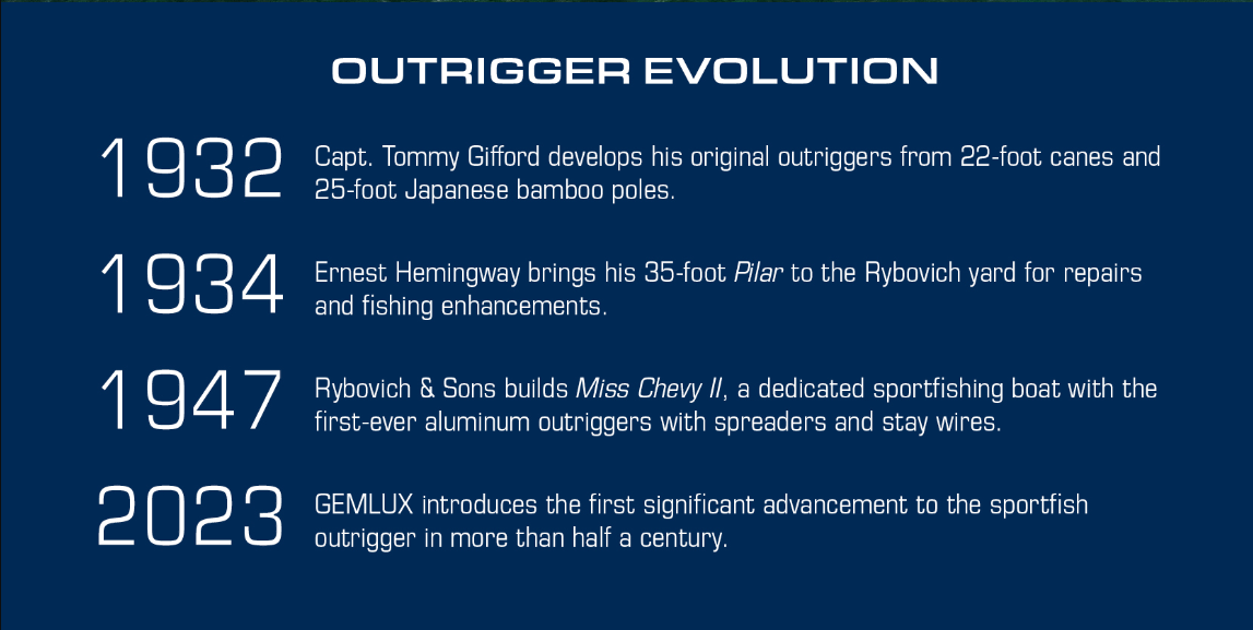 Outriggers have been essential to the success of offshore fisherman since Capt. Tommy Gifford patched together his first poles of bamboo and cane, and proceeded to catch and Atlantic blue marlin with the novel accoutrements. His original attempts to skip bait on the surface and deliver a smooth drop-back to billfish were well received throughout the burgeoning sportfishing industry and mangy anglers were keen on the concept, not the material.